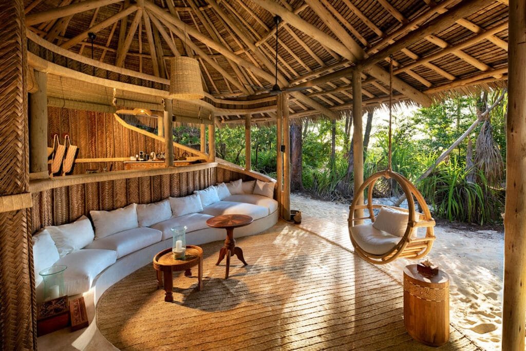 “The sense of seclusion and serenity is overwhelming. Further relaxation is from the immediate removal of shoes: this intimate island is constructed on sand and barefoot is the only way to go. The island is tiny, less than a mile, with 12 rustic cottages woven from palm fronds and nestled between a tropical forest and the white sand. But, as simple as the setup looks, the service is sophisticated with personal butlers arranging activities from snorkelling trips to observations of the turtles that come to nest on the beach to sunset sails aboard a traditional dhow.”
