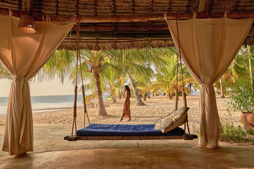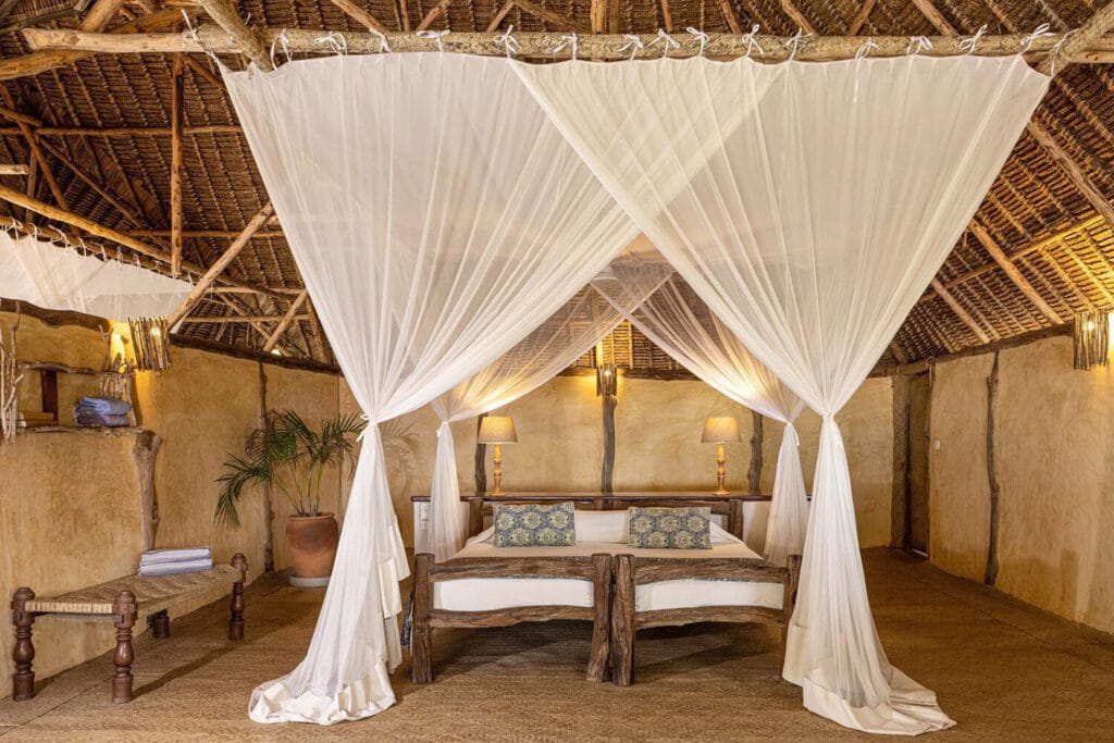 All the rustic and charming bedrooms are made with locally sourced materials – coral rock masonry, driftwood and mangrove poles, floors of mkeka woven palm matting and roofs of makuti palm thatching. The rooms are simple and uncluttered, with open-air windows with neither shutters nor glass. Every room has an oversized walk-in mosquito net, overhead fan and an ensuite bathroom. Each room also has a veranda with easy chairs and a swing bed.