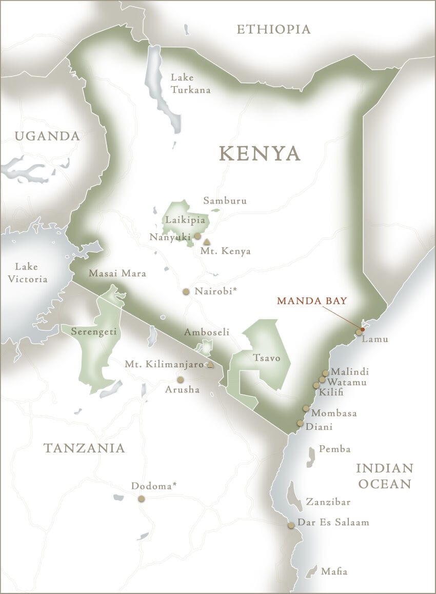 Surrounded by miles of soft white sand and coconut palms, Manda Bay sits in a sheltered position on the unspoilt northeastern tip of Manda Island. The lodge looks out across the deepwater channel that separates Manda and Pate islands from the Kenyan mainland and the Indian Ocean. Both Lamu Airport and Lamu Town are about 8 miles (12.5km) away by boat and the trip by speedboat takes less than 30 minutes via the narrow Mkanda Channel (‘the belt’). Light aircraft can also land at the private strip beside the lodge.